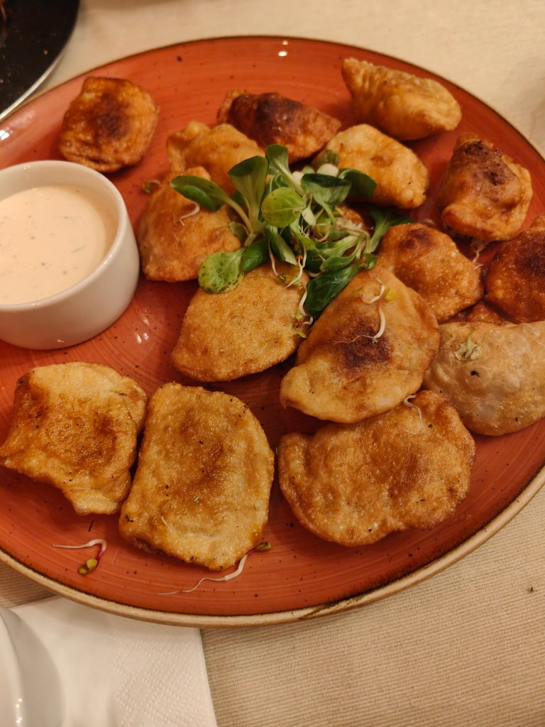 - Pierogi: Consisten en una masa a mitad de camino entre las empanadillas españolas y los raviolis, que puede ir relleno de diferentes productos, tanto dulces como salados. Algunos de los más típicos son los pierogi ruskie rellenos de patata y queso tipo requesón, o los pierogi z kapustą i grzybami rellenos de col fermentada y champiñones, también los hay de carne picada. También están deliciosos en versión dulce, rellenos de arándanos, por ejemplo y con crema agria. Normalmente se puede elegir el relleno y el topping para ponerles por encima, siendo el más típico la mantequilla derretida con cebolla caramelizada