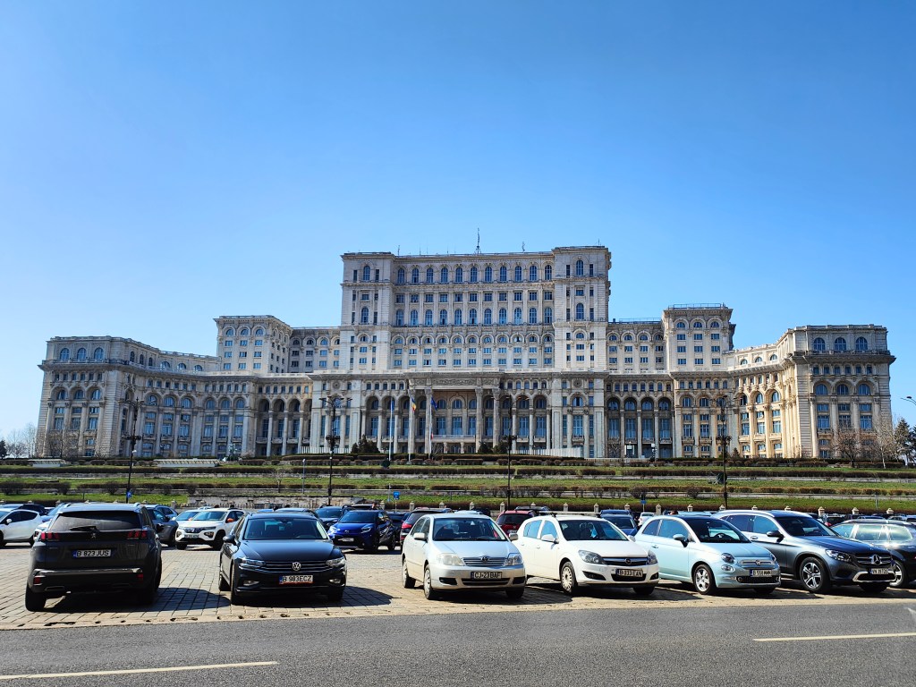 Por último y después de casi 3 horas llegamos al Palacio del Parlamento de Bucarest, es el segundo edificio mas grande del mundo y es el mas pesado del mundo. La historia del Palacio del Parlamento Rumano se remonta a 1985, cuando Nicolae Ceaușescu, dictador de Rumania, tuvo la idea de hacer este descomunal edificio para que le sirviera como sede del poder político/administrativo