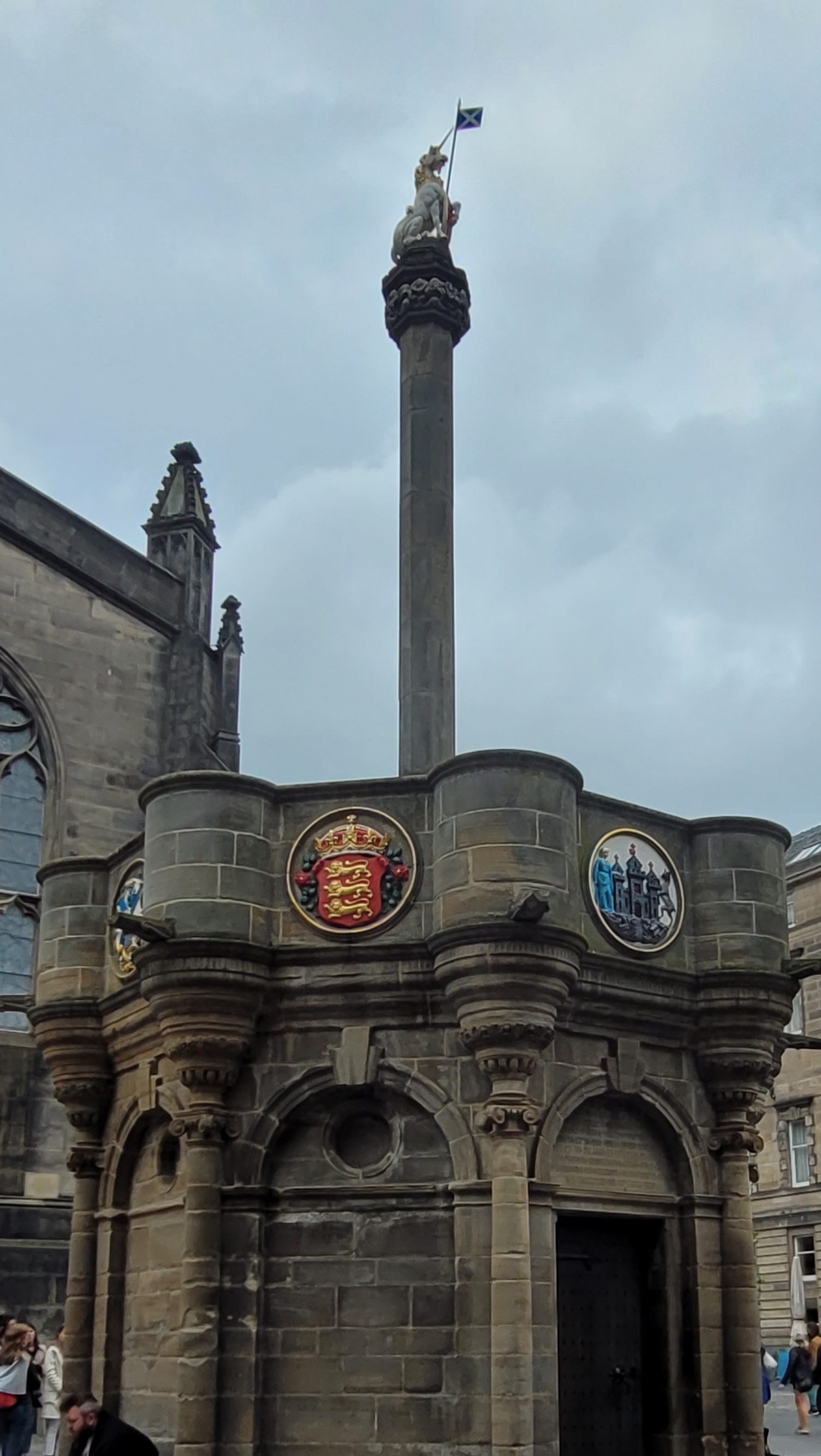 El free tour comenzó en la 190 High Street, al lado de la catedral de st Giles y lo sacamos desde aquí. La primera parada fue Mercat Cross. La cruz del mercado principal de Edimburgo