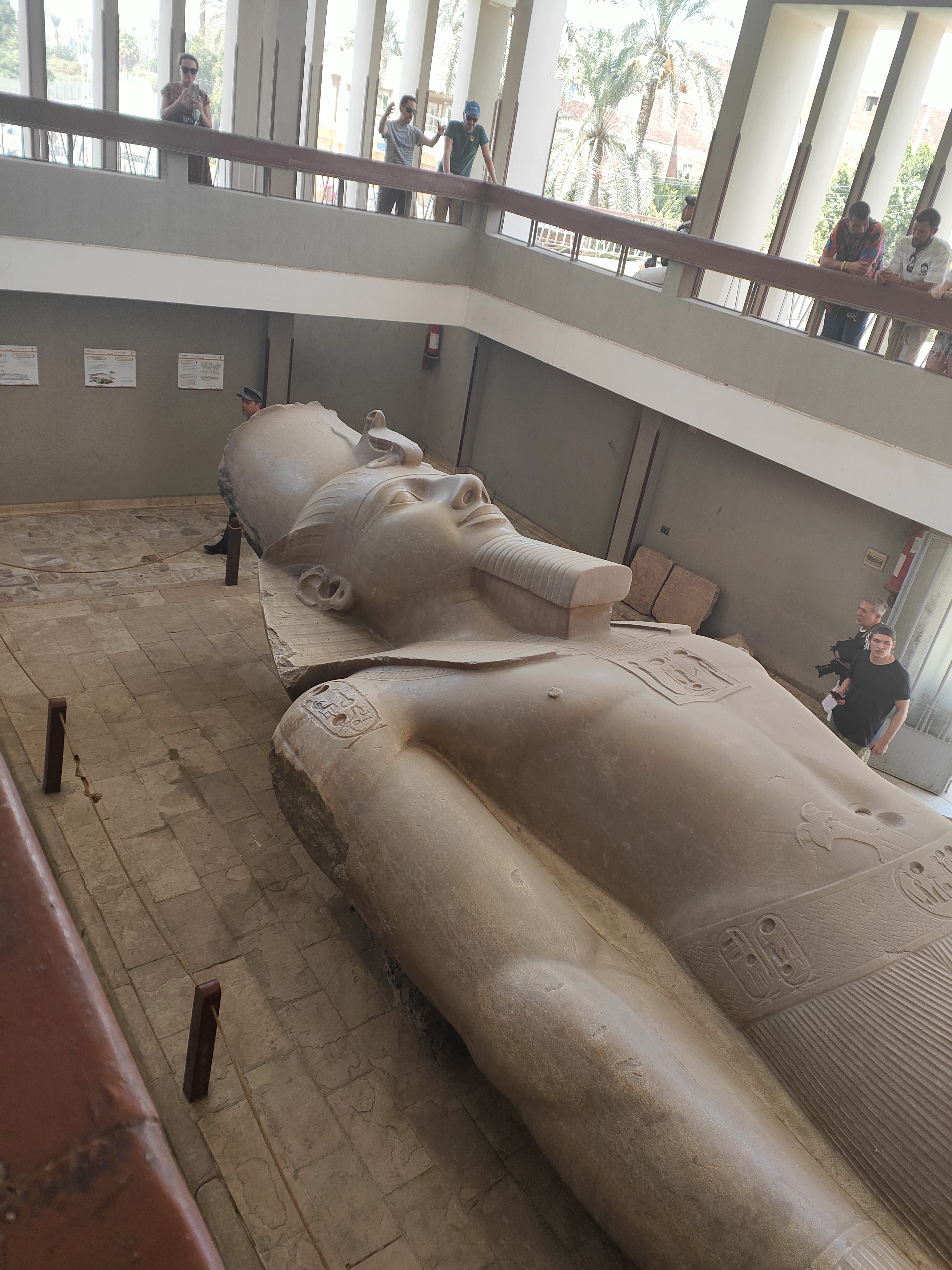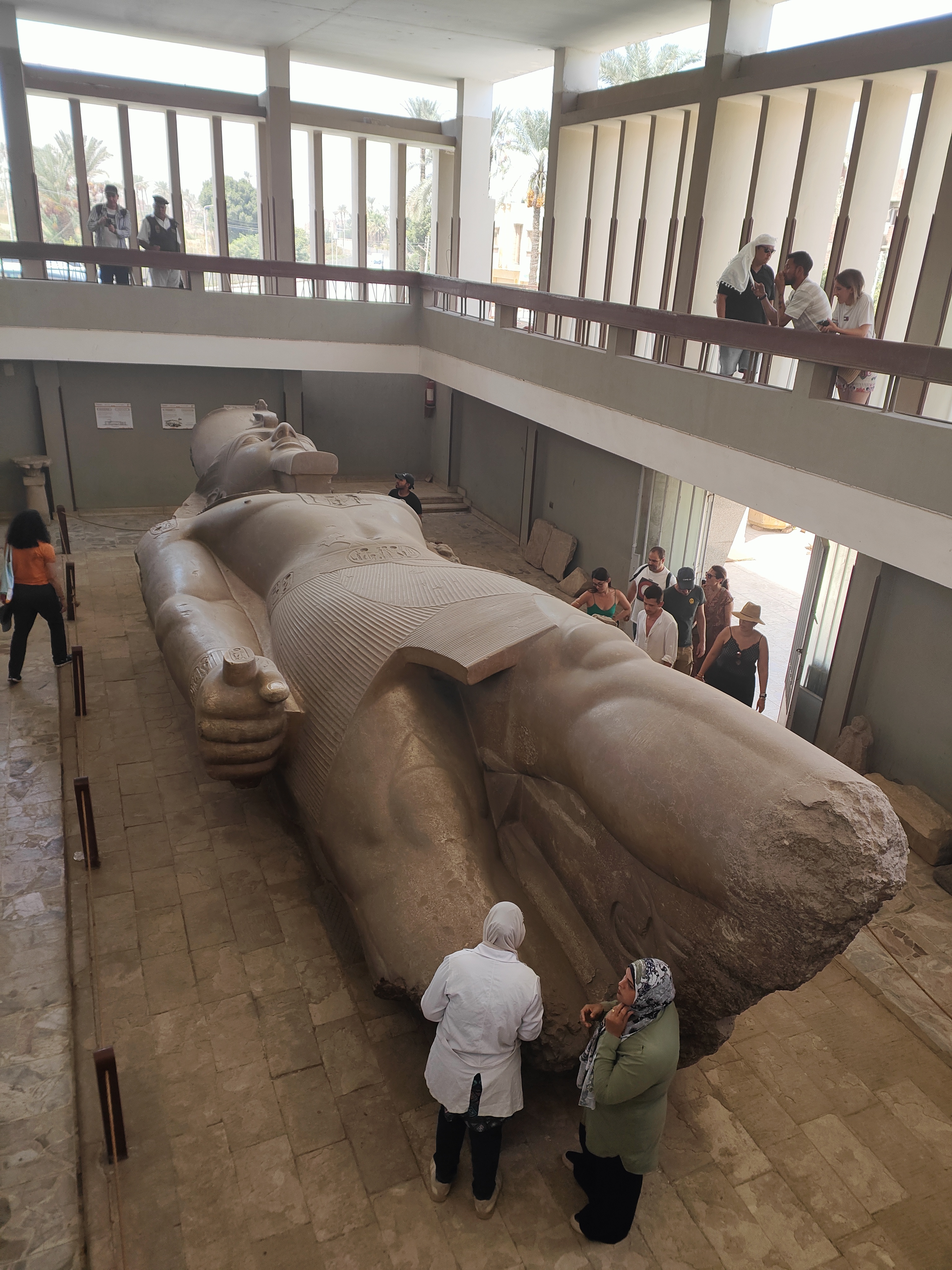 Dentro de la sala cubierta nos encontramos con el coloso de Ramsés II, es una escultura gigante de 12 metros de altura tallada en el imperio nuevo durante el reinado de este faraón. Ramsés II fue un faraón que gobernó unos 66 años, es a menudo recordado como el faraón más grande, la primera parte de su reinado estuvo enfocada en la construcción de ciudades, templos y monumentos. Fundó la ciudad de Pi- Ramsés y desde allí lanzó sus campañas militares en Siria. Fué un rey guerrero que durante los cinco primeros años llevó a cabo cinco acciones militares: