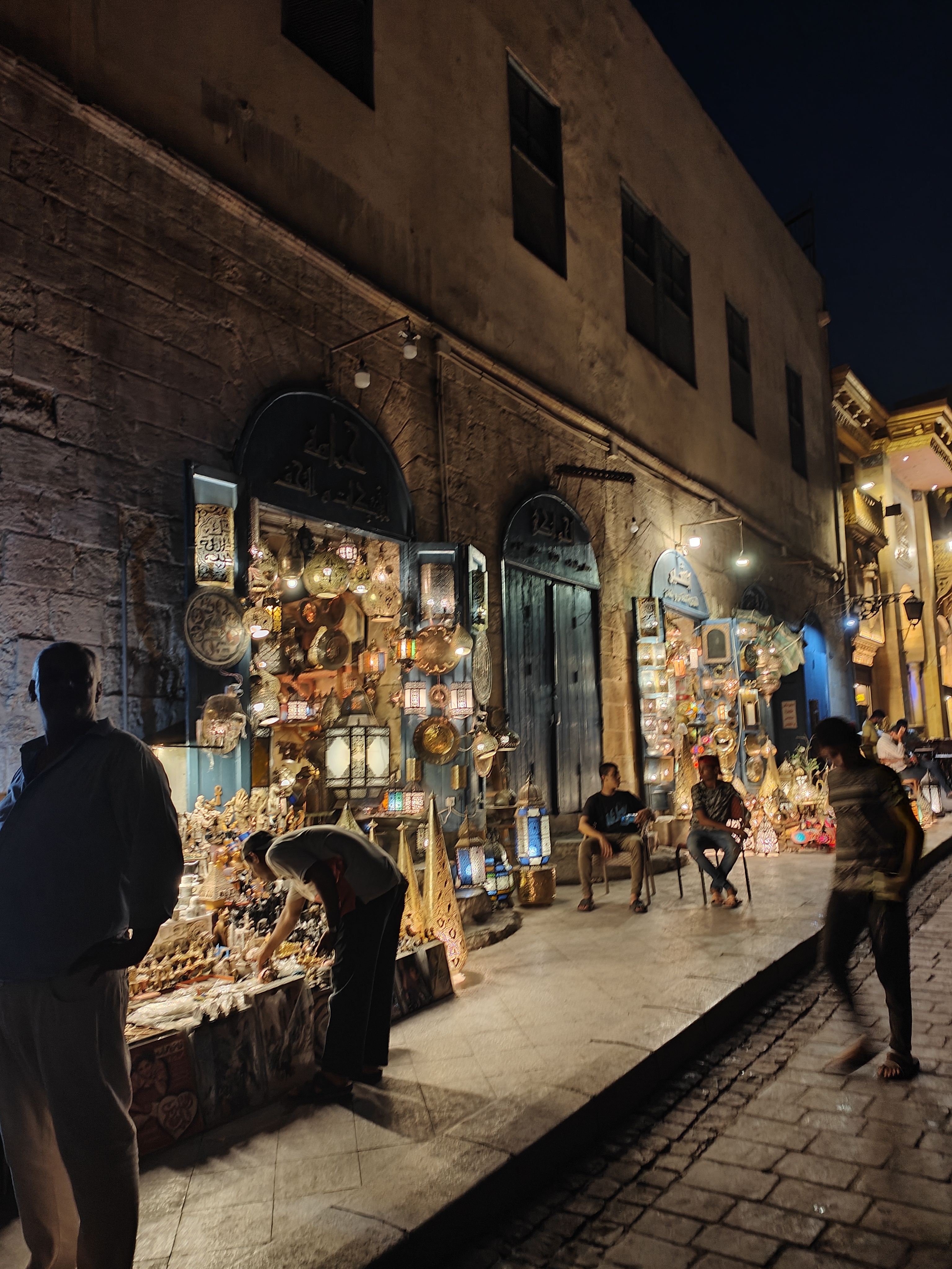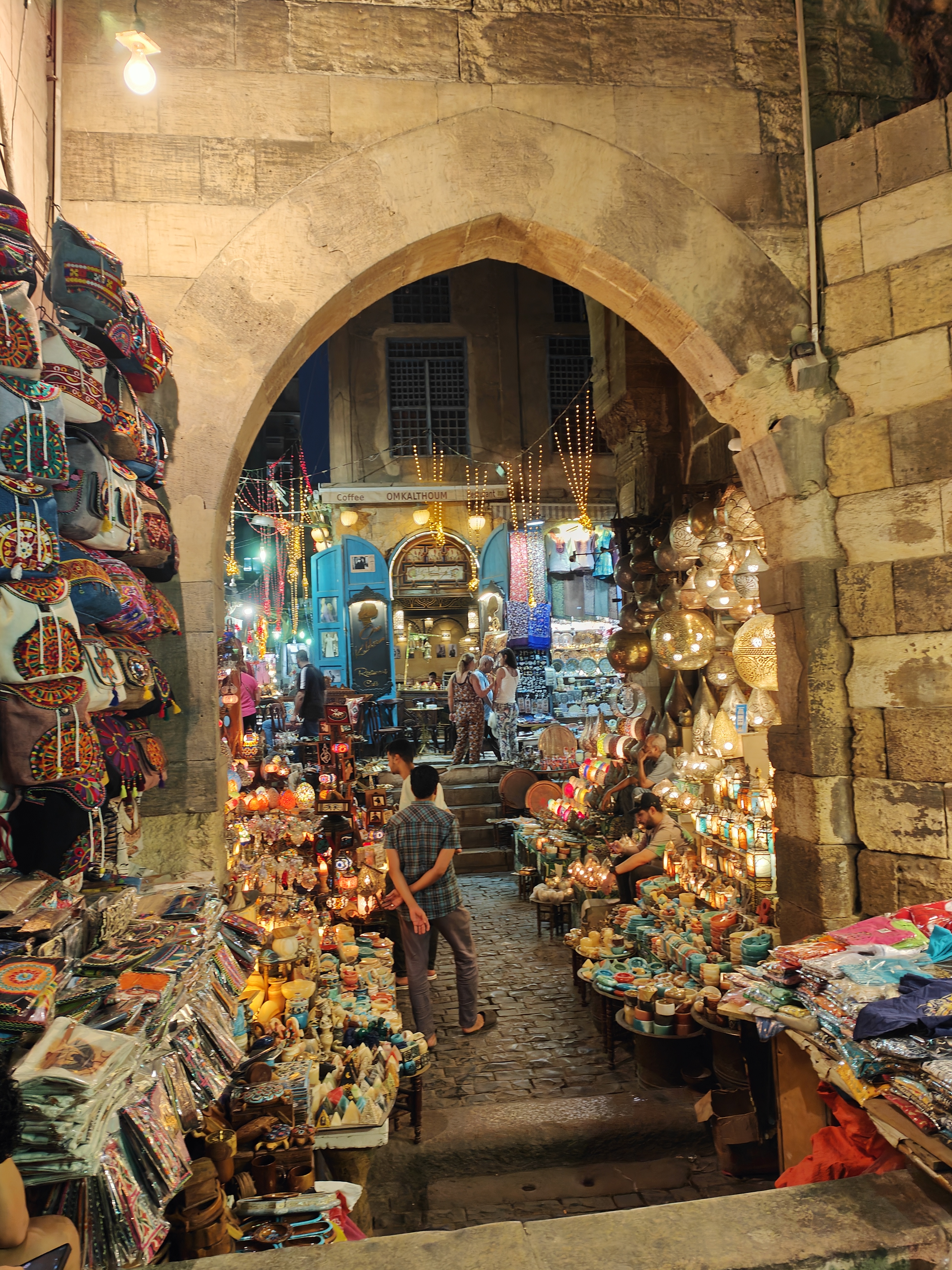 Otra vez de vuelta al bus con nuestro grupo, fuimos recogiendo a mas compañeros para disfrutar del encanto del Cairo por la noche. Primero fuimos al bazar khan el khalili y nos tomamos un te en el café de los espejos, las calles eran muy estrechas y súper transitadas, con olor a especias y llenas de luces y colores, pero nos encantó la experiencia, estábamos metidos de lleno en esta magnífica cultura. Fuimos paseando por el bazar por la avenida mas antigua, nuestro guía nos estuvo explicando la historia de varias mezquitas, las murallas, como era el Cairo hace mucho, mucho tiempo, fue súper mágico caminar al anochecer por allí.