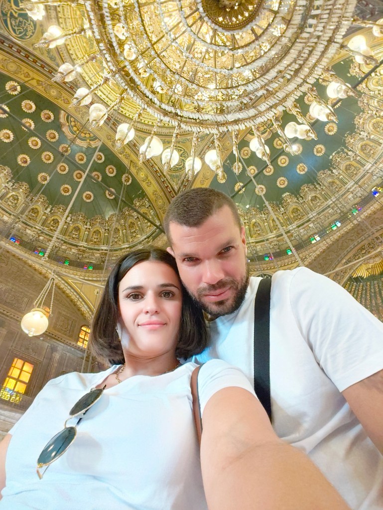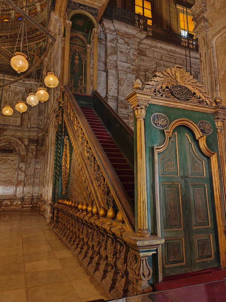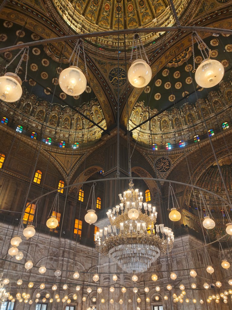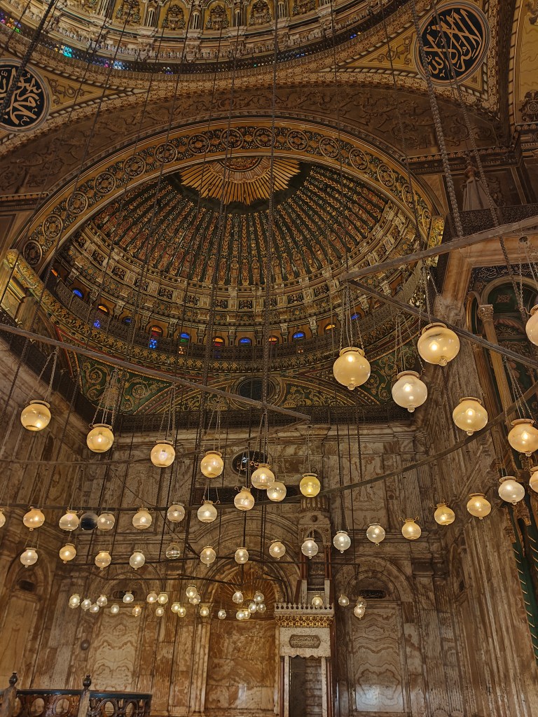 Al entrar nos tuvimos que descalzar y tener los hombros y las piernas tapadas. Por dentro es preciosa con un montón de lámparas en el techo, color dorado, verde y blanco del alabastro de las paredes, al salir a las terrazas, se veían unas vistas preciosas del Cairo que no os podéis perder.