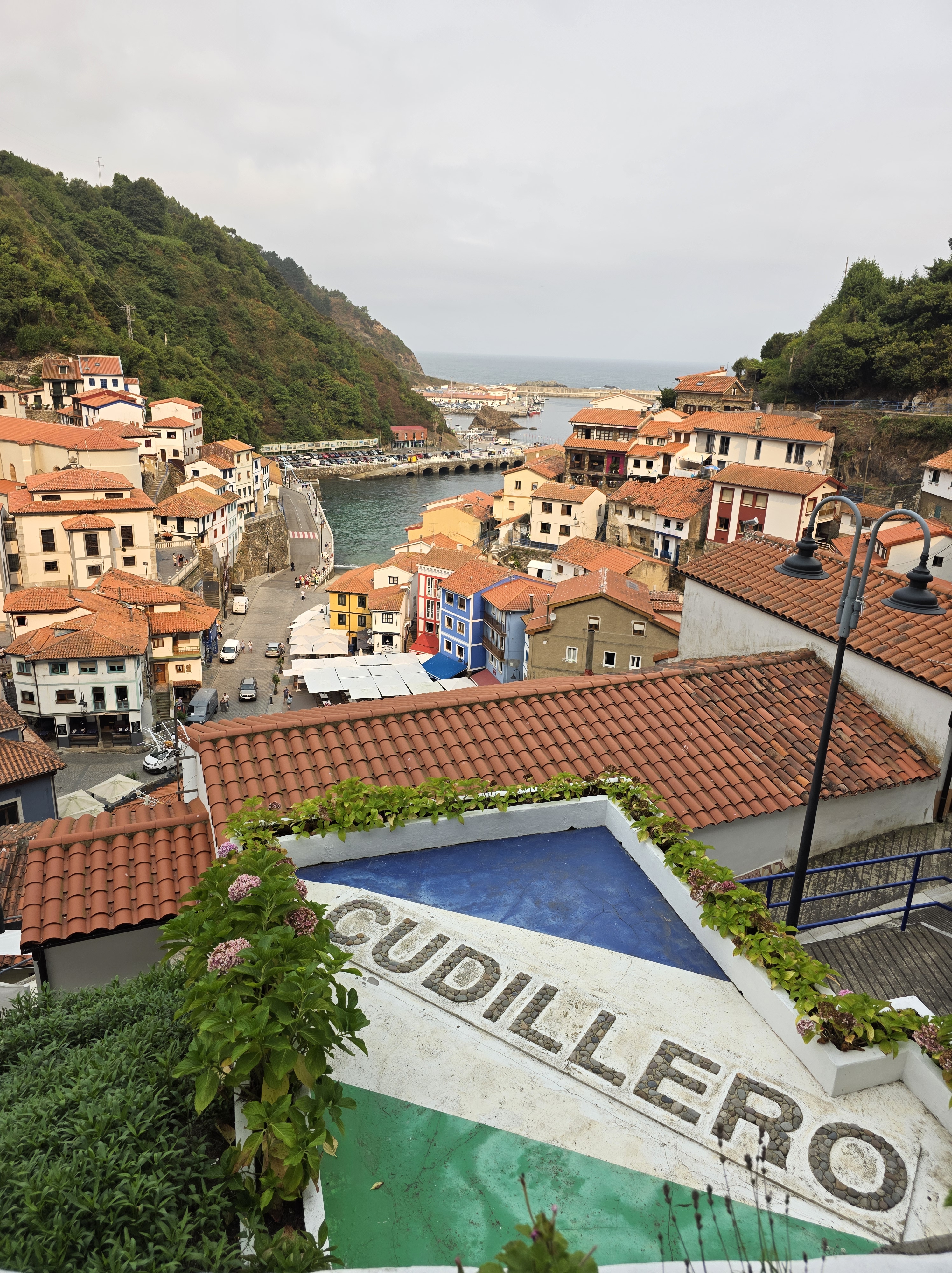 Al lado del puerto, hay unas letronas grandes con el nombre de Cudillero donde se ve el pueblecito por detrás.
